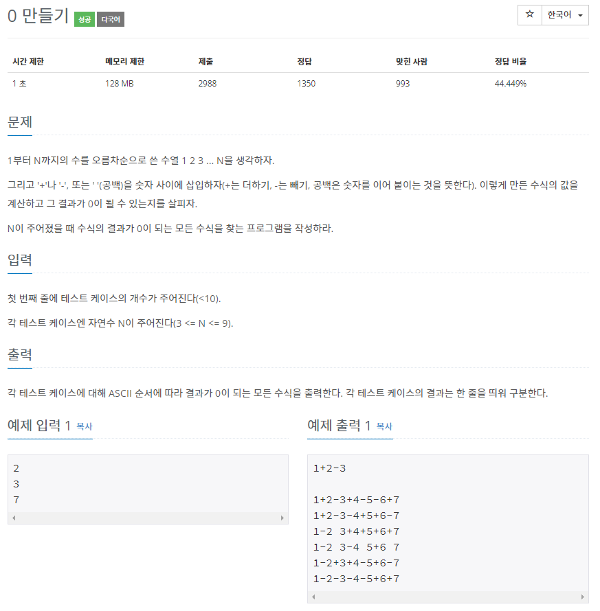 - 1부터 n까지의 숫자가 담겨있는 integer배열과 부호의 모든 경우를 담은 operators_list배열을 통해 모든 수식을 만들어가면서 수식의 합이 0이 되면 출력해주면 된다.