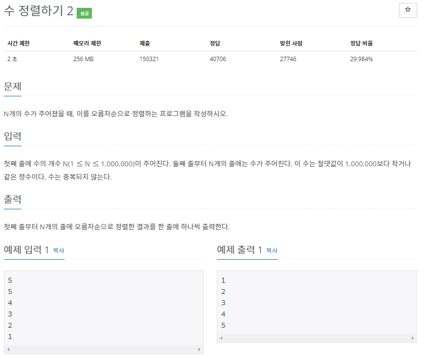 - 병합 정렬, 퀵 정렬을 제출해봤지만 퀵 정렬은 메모리 초과가 되었다. 아무래도 퀵 정렬은 정렬이 되어있는 상태라면 시간 복잡도가 현저히 안 좋아져서 그런 것 같다.