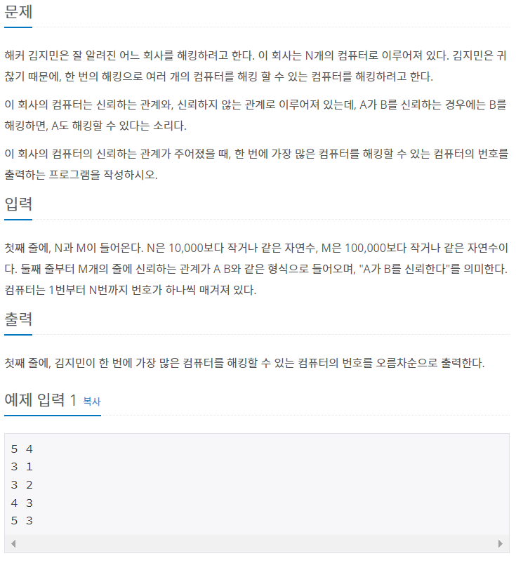 첫째 줄에, N과 M이 들어온다. N은 10,000보다 작거나 같은 자연수, M은 100,000보다 작거나 같은 자연수이다. 둘째 줄부터 M개의 줄에 신뢰하는 관계가 A B와 같은 형식으로 들어오며, "A가 B를 신뢰한