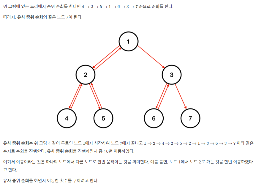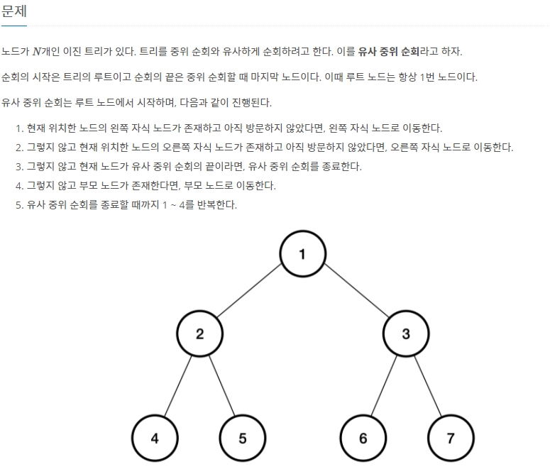 노드가 $N$개인 이진 트리가 있다. 트리를 중위 순회와 유사하게 순회하려고 한다. 이를 유사 중위 순회라고 하자. 순회의 시작은 트리의 루트이고 순회의 끝은 중위 순회할 때 마지막 노드이다.