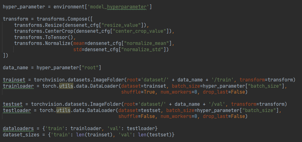 원하는 데이터셋(사용자가 분류하고 싶은 데이터셋)을 로드하는 부분입니다. 따로 모듈화를 한 것은 한 파일안에 모든 코드가 들어가는 것이 보기 않좋아 보였습니다.
