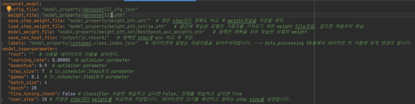 - yaml파일 안에서도 크게 두 부분으로 나뉘는데 densenet_model은 모델이 학습하고 난 뒤에 담길 가중치 파일들과 평가도중에 만든 csv, heatmap들을 저장하는 경로들이 담겨있습니다.