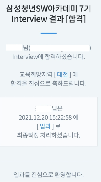 이번 하반기에 서탈, 면탈, 최탈 다 경험해보면서 스스로 실력이 많이 부족하다고 느꼈고 과연 내가 지금 취업을 하더라도 회사에서 잘할 수 있을지 걱정도 많았다. 애초에 졸업하면 SSAFY를 통해 프로젝트 경험을 쌓고 싶었고 그전에 여러 기업에 지원하고 면접 경험을 쌓았던 것이 SSAFY 면접에서 많이 도움이 됐던 것 같다.