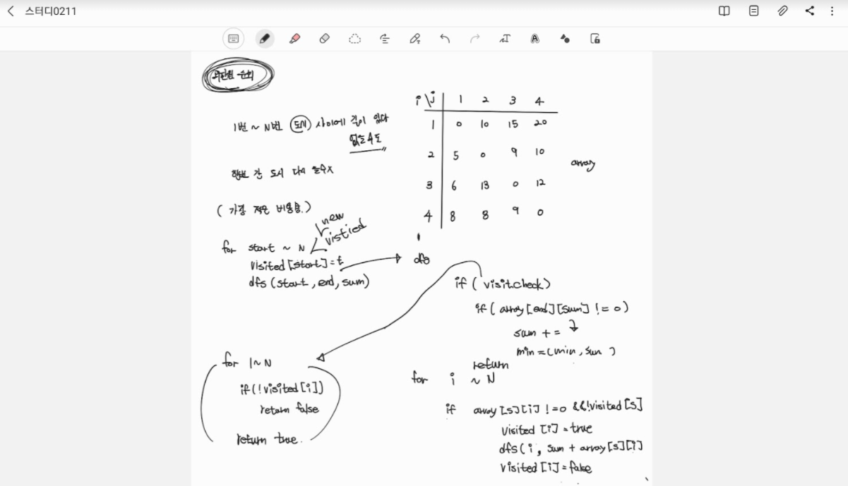 - 그리고 이전 코드에서는 visited방문배열을 dfs함수안에 들어갈때마다 모든 도시가 방문처리가 되었는지 체크를 해줬는데 그럴 필요가 없었다. 어차피 depth가 N-1개가 된다면 모두 true가 되었을테니까.. 이 생각을 왜 못했지