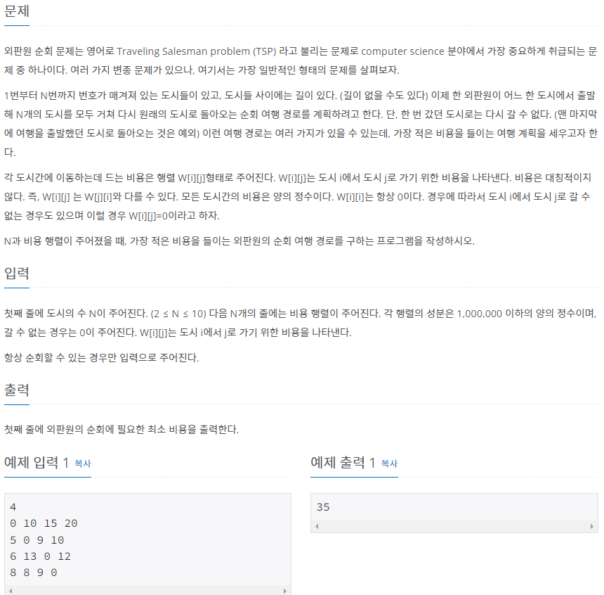 첫째 줄에 도시의 수 N이 주어진다. (2 ≤ N ≤ 10) 다음 N개의 줄에는 비용 행렬이 주어진다. 각 행렬의 성분은 1,000,000 이하의 양의 정수이며, 갈 수 없는 경우는 0이 주어진다. W[i][j]는 도시 i에서 j