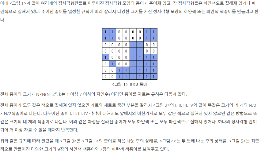 첫째 줄에는 전체 종이의 한 변의 길이 N이 주어져 있다. N은 2, 4, 8, 16, 32, 64, 128 중 하나이다. 색종이의 각 가로줄의 정사각형칸들의 색이 윗줄부터 차례로 둘째 줄부터 마지막 줄까지 주어진다.