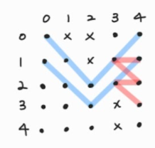 - 이 부분에서 막혔고 이를 처리하기 위해서 flag를 변수를 두어 (0, 4)에 도달했다면 true를 저장하고 쌓여있던 dfs(1, 3)에게 true면 return 시키도록 했다. 그럼 dfs(1, 4), dfs(2,4)를 방문하지 않고 연쇄적으로 스택에 쌓여있던 재귀 함수들은 종료될 것이다. - 위 그림이 예제의 확실한 정답인지 모르겠지만 빨간색은 연결되면 안 되는 파이프이고 파란색이 파이프가 연결된 선이다.