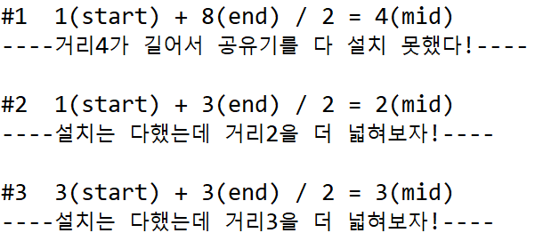 **if(mid + installed <= house[i])** {//#2. 중간값 + 공유기설치한집의 좌표 보다 다음 집의 좌표가 크다면