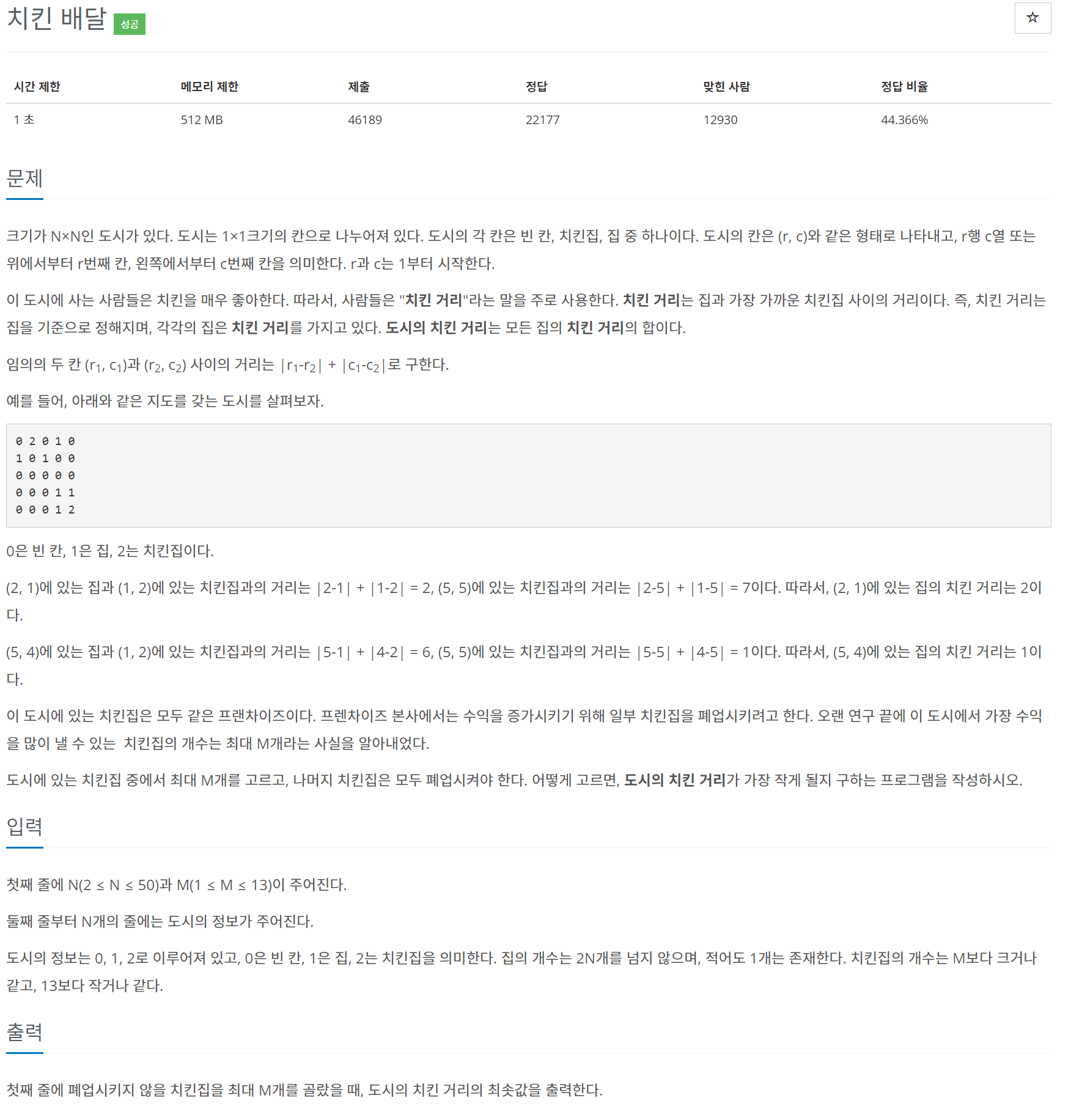 크기가 N×N인 도시가 있다. 도시는 1×1크기의 칸으로 나누어져 있다. 도시의 각 칸은 빈 칸, 치킨집, 집 중 하나이다. 도시의 칸은 (r, c)와 같은 형태로 나타내고, r행 c열 또는 위에서부터 r번째 칸