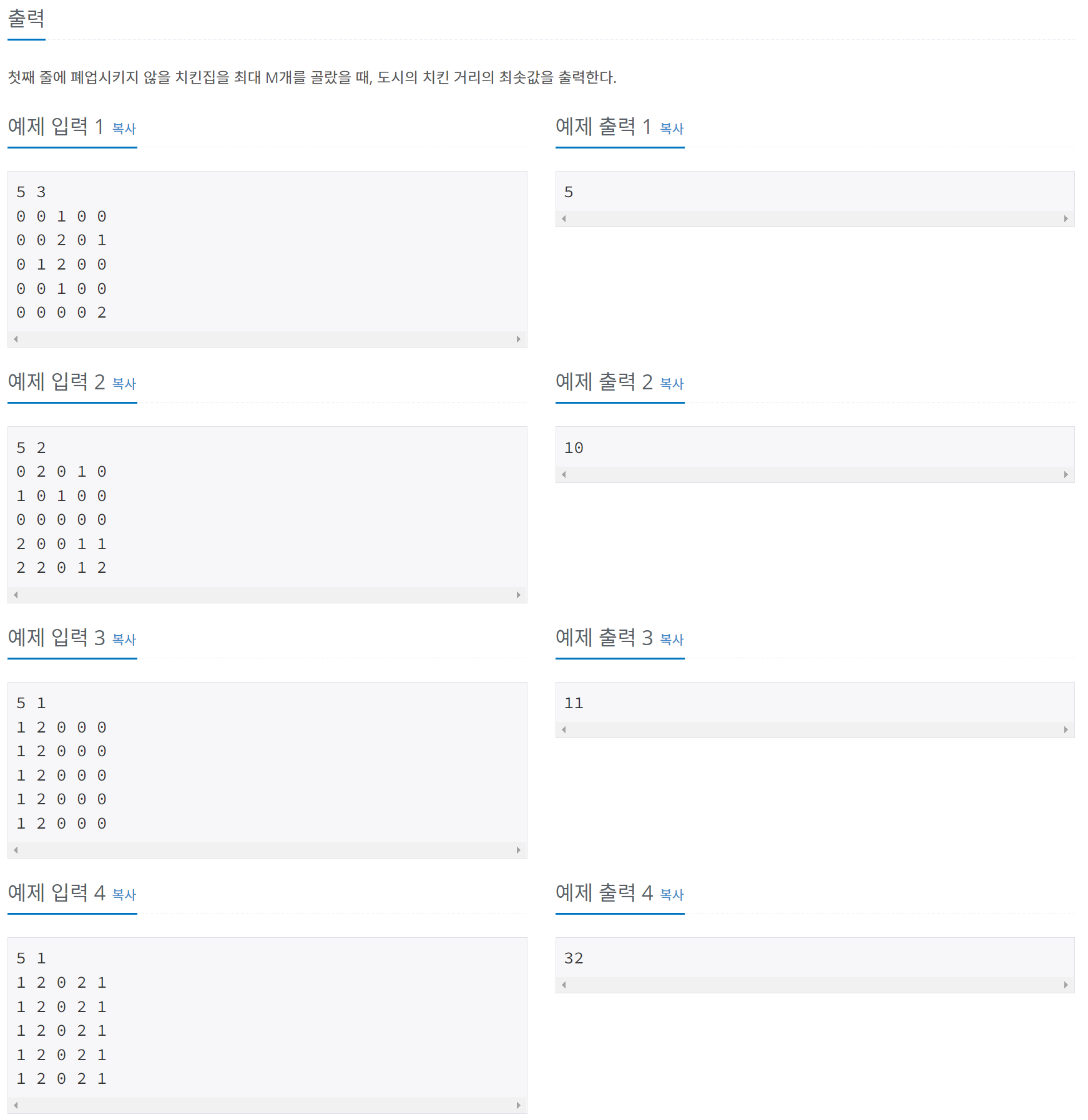 - 또 그래프로 입력을 받지만 ArrayList에 집과 치킨집을 따로 담아준다. 그리고 입력으로 주어지는 그래프에서 치킨집의 개수와 M은 다르다. 이걸 한참 후에 발견한 나는 틀려 마땅했다.