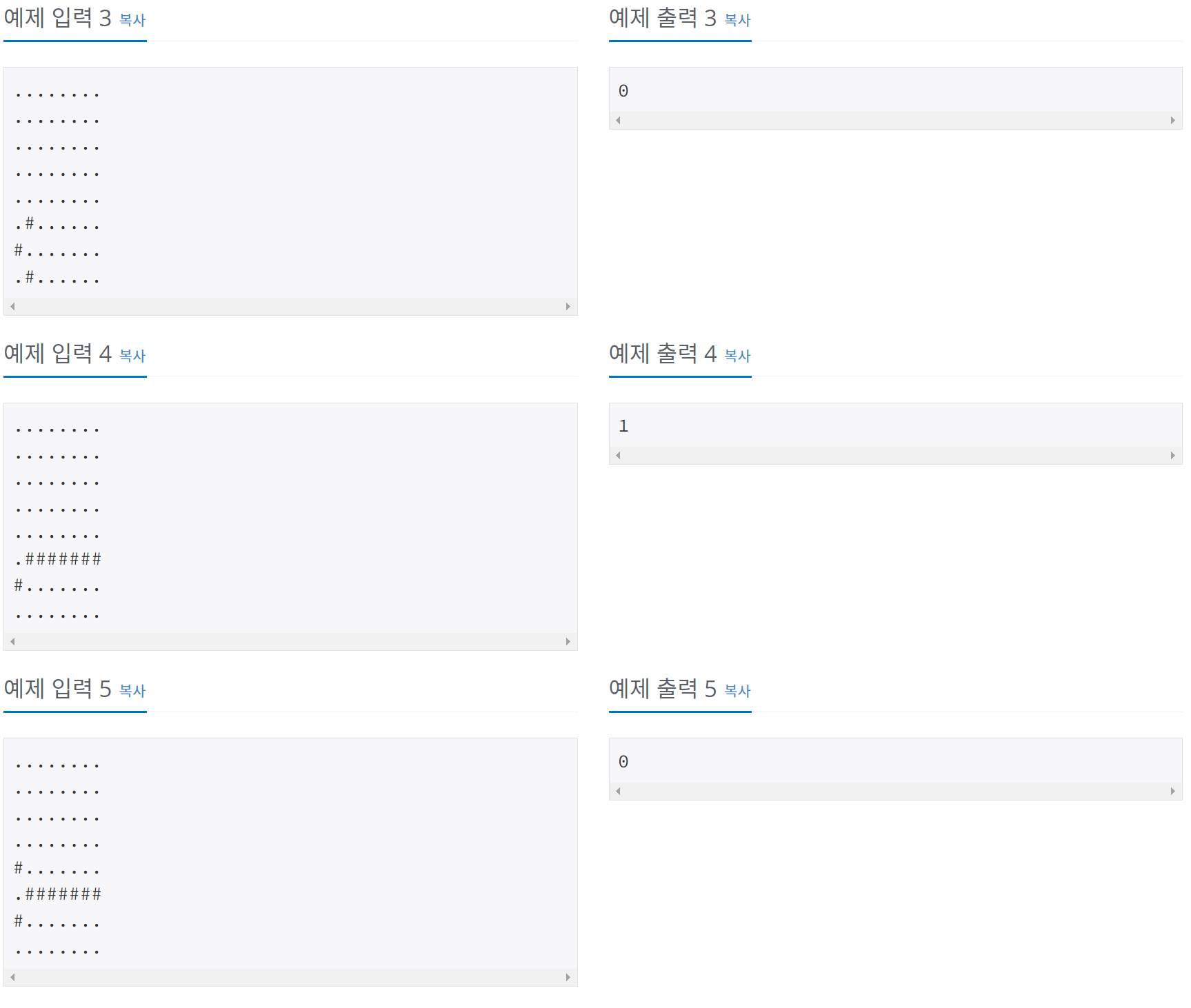 욱제는 학교 숙제로 크기가 8×8인 체스판에서 탈출하는 게임을 만들었다. 체스판의 모든 칸은 빈 칸 또는 벽 중 하나이다. 욱제의 캐릭터는 가장 왼쪽 아랫 칸에 있고, 이 캐릭터는 가장 오른쪽