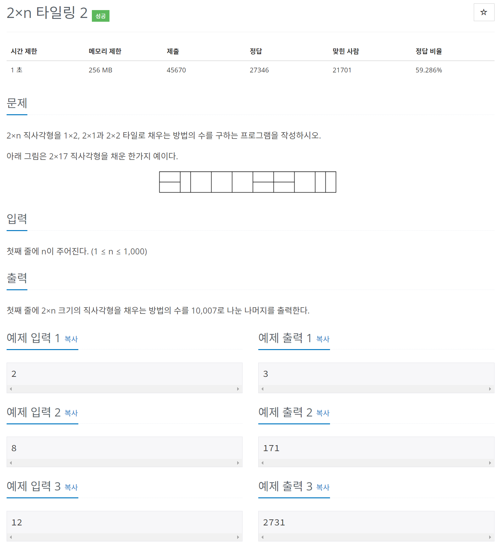 2×n 직사각형을 1×2, 2×1과 2×2 타일로 채우는 방법의 수를 구하는 프로그램을 작성하시오. 아래 그림은 2×17 직사각형을 채운 한가지 예이다.