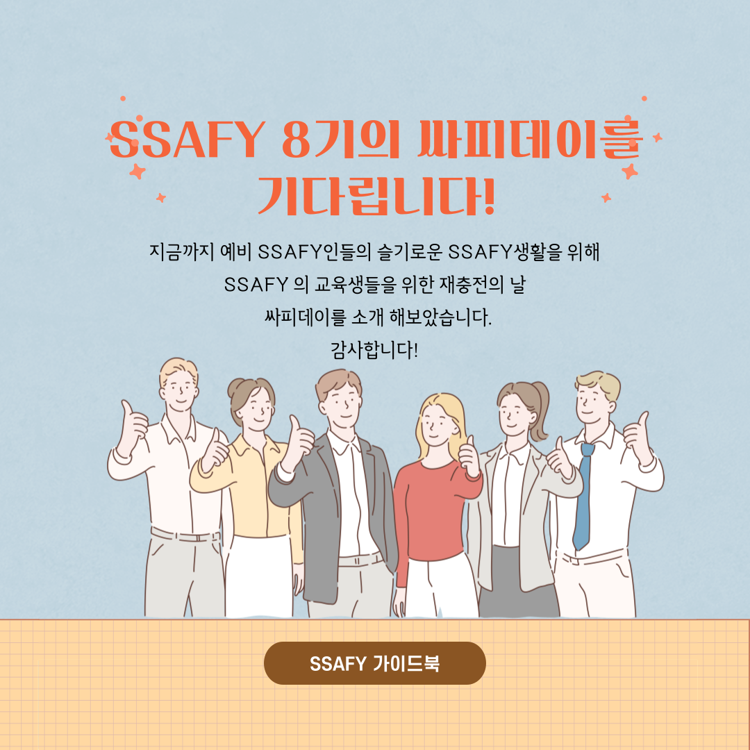 | [슬기로운 SSAFY생활 - 3화] SSAFY의 자치회 알아보기 (2) | 2022.05.08 |