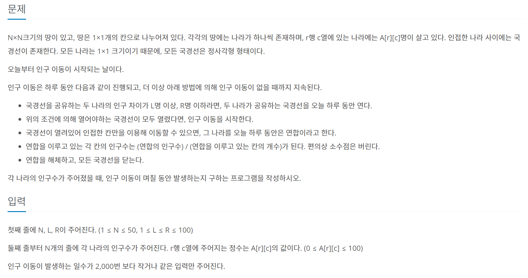 N×N크기의 땅이 있고, 땅은 1×1개의 칸으로 나누어져 있다. 각각의 땅에는 나라가 하나씩 존재하며, r행 c열에 있는 나라에는 A[r][c]명이 살고 있다. 인접한 나라 사이에는 국경선이 존재한다. 모