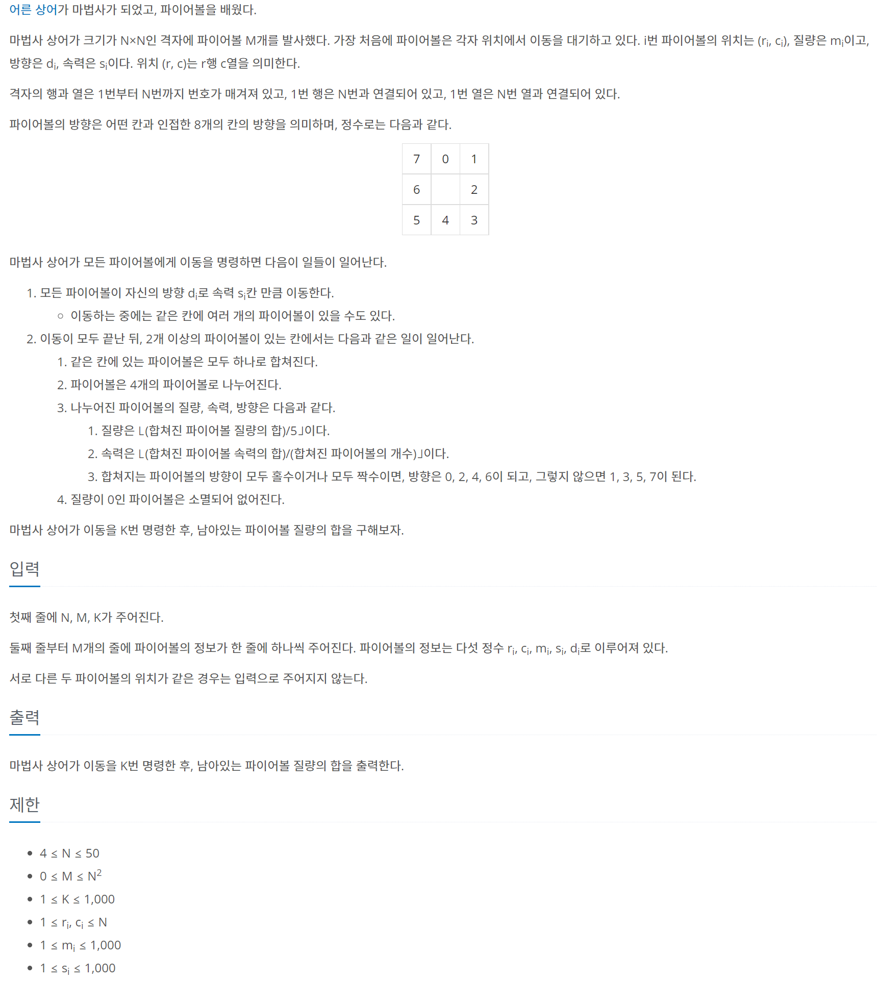 첫째 줄에 N, M, K가 주어진다. 둘째 줄부터 M개의 줄에 파이어볼의 정보가 한 줄에 하나씩 주어진다. 파이어볼의 정보는 다섯 정수 ri, ci, mi, si, di로 이루어져 있다. 서로 다른 두 파이어볼의 위치