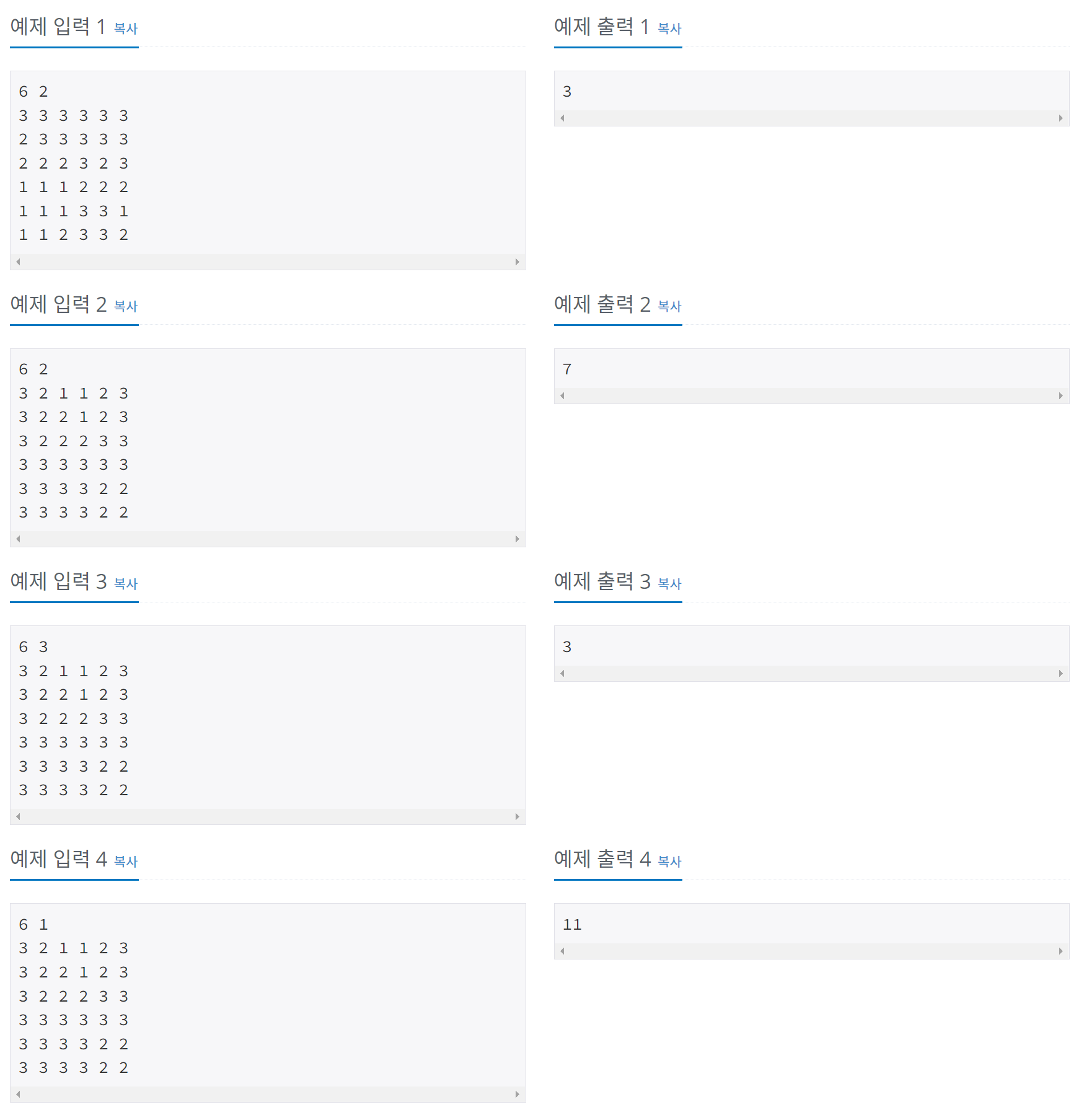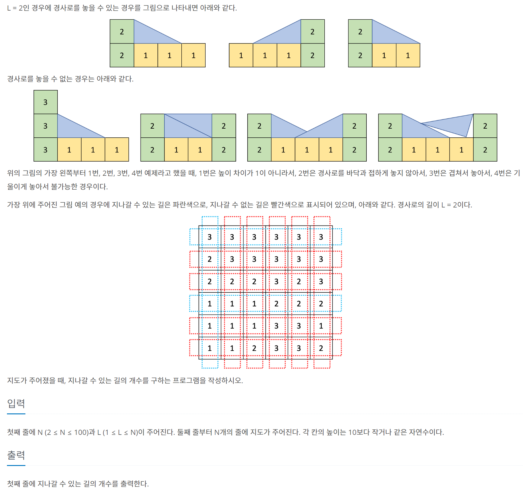 첫째 줄에 N (2 ≤ N ≤ 100)과 L (1 ≤ L ≤ N)이 주어진다. 둘째 줄부터 N개의 줄에 지도가 주어진다. 각 칸의 높이는 10보다 작거나 같은 자연수이다.