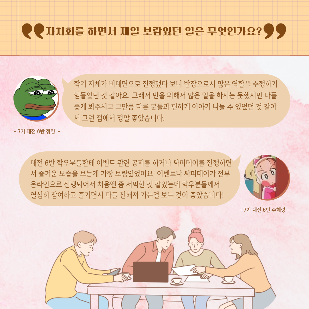 정 진 반장님 : 여러모로 비대면이라는 점에서 굉장히 아쉬운 시간이 지나갔습니다. 한분 한분 직접 얘기 할 때는 할 말도 많고 재밌는 분들도 계셨는데 막상 수업 시간 이외엔 만나기도 힘들고 수업시간에도 각자 수업만 받고 헤어지면서 서로에 대해 아직도 잘 모르고 어색한 분들이 많아서 아쉽습니다. 좀 더 친해지고자 싸피데이도 더 열심히 해보기도 했지만 확실히 대면으로 직접 만나서 소통하는것만 못하다는 느낌도 드네요. 앞으로 얼마 남지 않은 시간 더 친해졌으면 좋겠습니다.