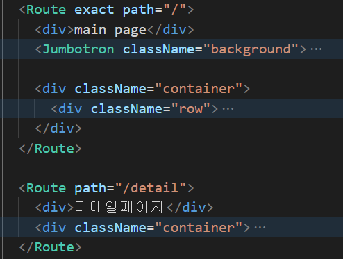 <Route>태그로 main과 detail페이지를 나누어 작성하면 됩니다. 주의할 점은 exact 속성을 넣어주지 않으면 /detail 페이지로 이동했을때도 main페이지의 내용이 나오기 때문에 exact 속성을 넣어주어야 합니다.