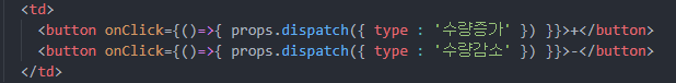 이제 cart.js에서 버튼에 해당하는 부분에서 dispath로 미리 정의해둔 수정 방법을 적용하기 위해 type에 원하는 값을 넣어주면 됩니다.