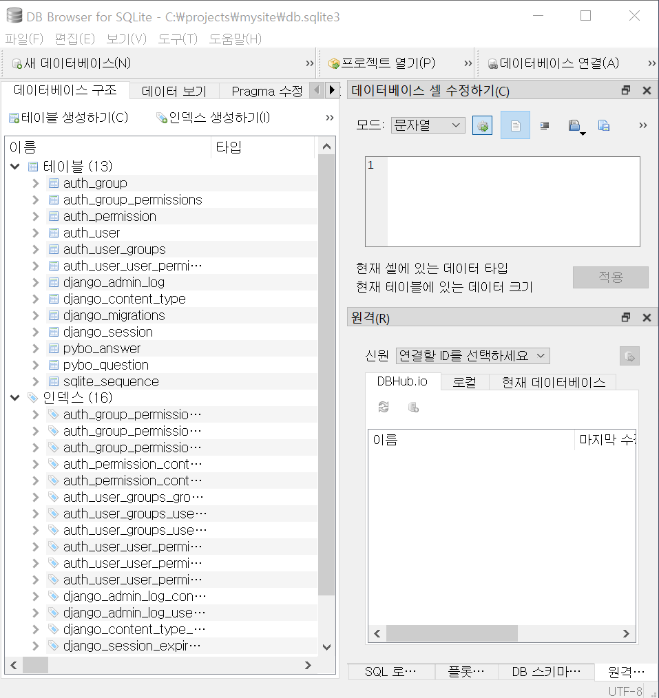 설치된 SQLite에서 [데이터베이스 열기]를 누르고 나의 db.sqlite3 파일을 누르면 테이블을 확인할 수 있다.