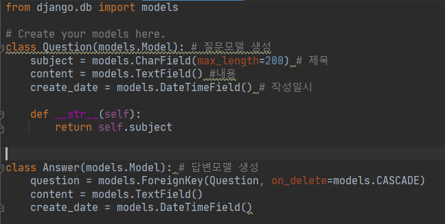 이제 준비는 다됐고 데이터가 들어가는 모델을 만들고 다음 속성을 가진 질문과 답변 모델을 생성하려 한다.