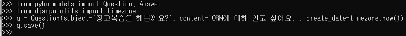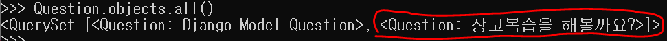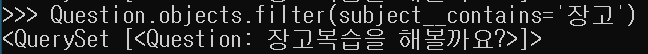 subject 속성에 '장고'라는 단어가 들어간 데이터를 찾고 싶을때는 subject__contains='장고'를 입력하면 된다. 여기서 언더바는 두 개라는 점을 유의해야 한다.
