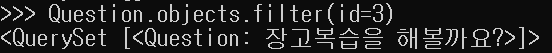 지금은 id가 3인 데이터가 하나라서 위처럼 나온다. 정말 하나만 찾고 싶을 때는 filter 대신 get을 이용하면 된다.