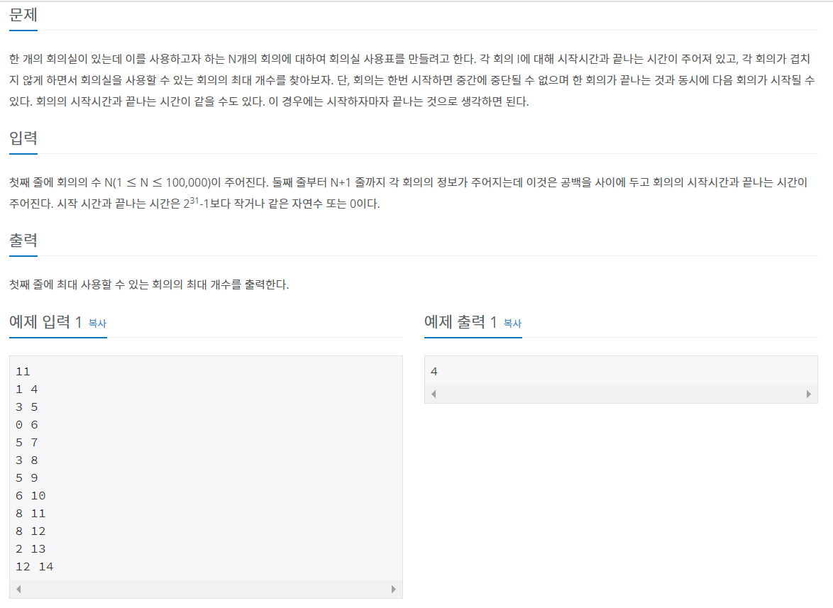- 빨리 끝날수 록 뒤에서 고려해볼 회의가 많기에 빨리 끝나는 회의 순서대로 정렬해야 합니다.