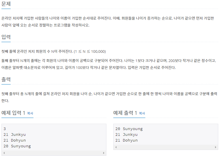 온라인 저지에 가입한 사람들의 나이와 이름이 가입한 순서대로 주어진다. 이때, 회원들을 나이가 증가하는 순으로, 나이가 같으면 먼저 가입한 사람이 앞에 오는 순서로 정렬하는 프로그램을