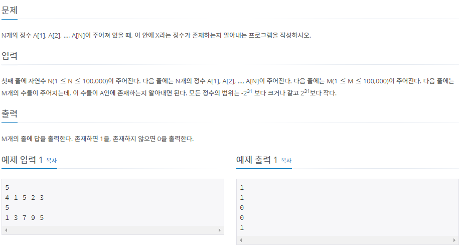 첫째 줄에 자연수 N(1 ≤ N ≤ 100,000)이 주어진다. 다음 줄에는 N개의 정수 A[1], A[2], …, A[N]이 주어진다. 다음 줄에는 M(1 ≤ M ≤ 100,000)이 주어진다. 다음 줄에는 M개의 수들이 주어지는데, 이 수들