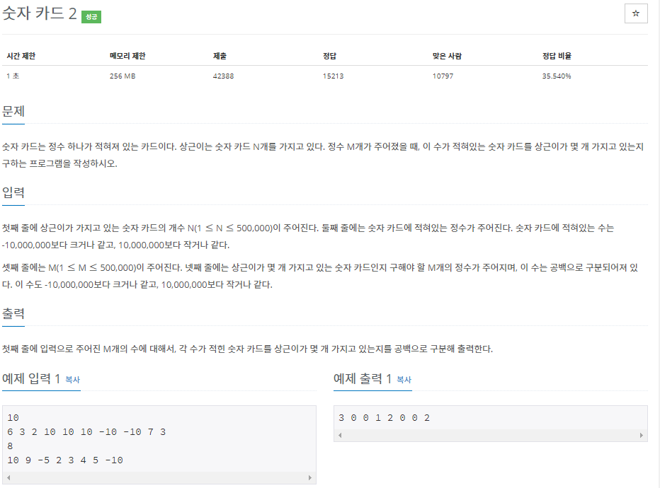 백준 단계별 풀어보기 '이진 탐색' 두 번째 문제를 풀어보았고 전에 풀었던 수 찾기와 매우 비슷한 문제라 금방 풀 수 있었다.