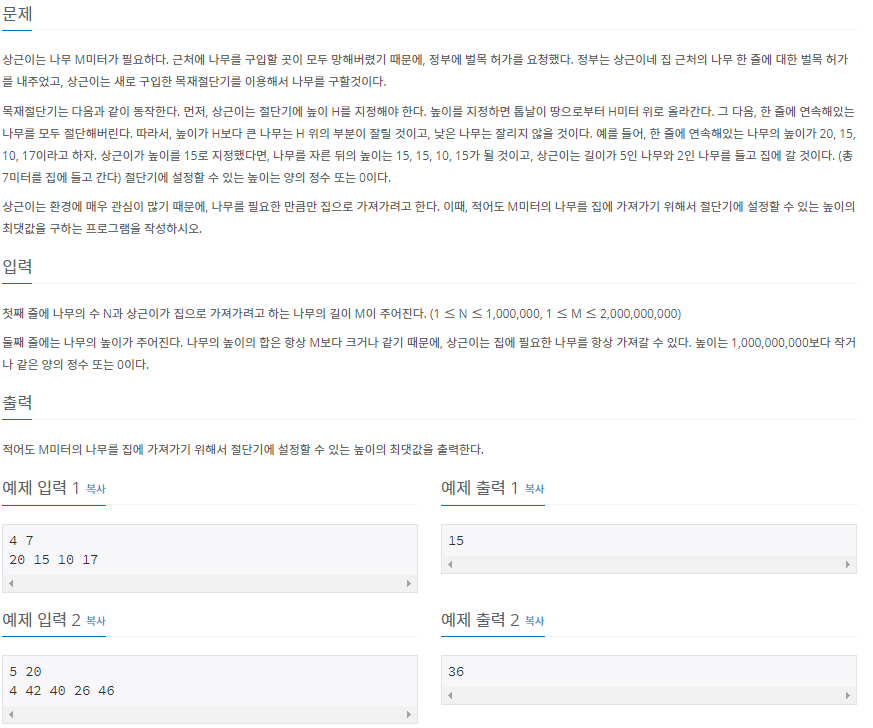 첫째 줄에 나무의 수 N과 상근이가 집으로 가져가려고 하는 나무의 길이 M이 주어진다. (1 ≤ N ≤ 1,000,000, 1 ≤ M ≤ 2,000,000,000) 둘째 줄에는 나무의 높이가 주어진다. 나무의 높이의 합은 항상 M보