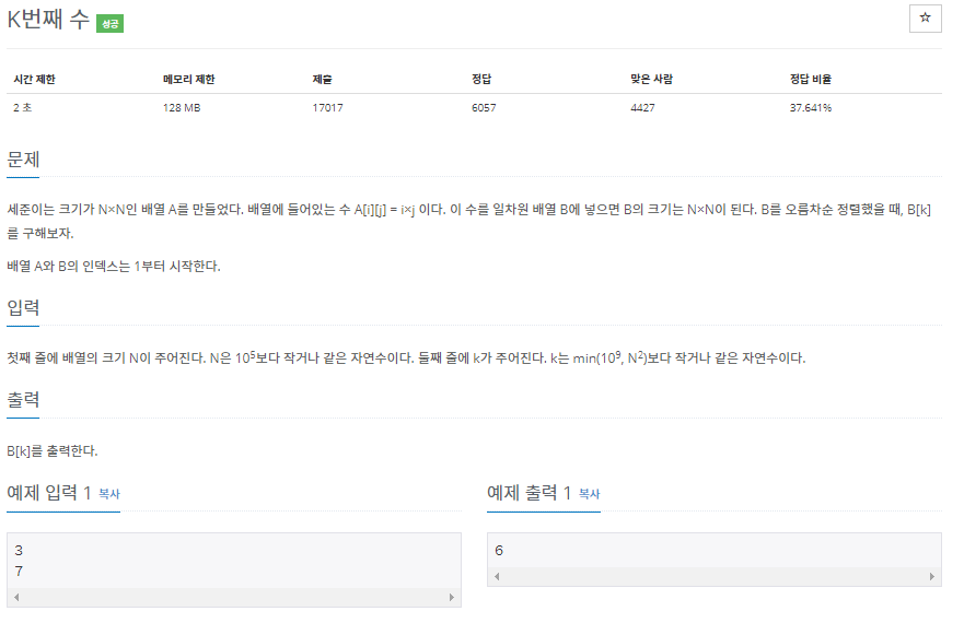 세준이는 크기가 N×N인 배열 A를 만들었다. 배열에 들어있는 수 A[i][j] = i×j 이다. 이 수를 일차원 배열 B에 넣으면 B의 크기는 N×N이 된다. B를 오름차순 정렬했을 때, B[k]를 구해보자. 배열 A와 B