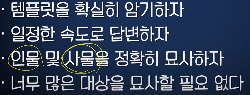 - 사물 묘사 시에는 관사 표현 주의하고 사람 묘사할 때는 현재 진행형을 반드시 사용