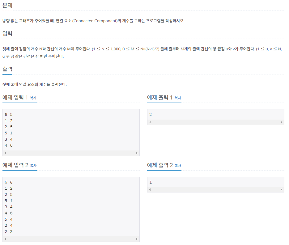 - 방향 없는 그래프에서 연결 요소를 구하는 문제이다. 첫 번째 예제 입력을 예로 들면 노드 1, 2 5가 연결되어있고 노드 3, 4, 6이 연결돼있으므로 총 2개가 답이 되는 것이다.