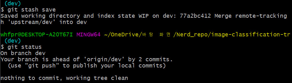 git stash명령어 후 git status 명령어로 확인해보니 스택에 들어간 것을 확인할 수 있습니다.
