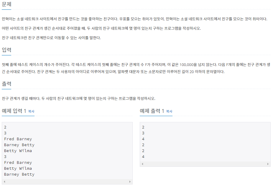 친구 네트워크 시간 제한 메모리 제한 제출 정답 맞은 사람 정답 비율 3 초 256 MB 11608 3704 1925 26.658% 문제 민혁이는 소셜 네트워크 사이트에서 친구를 만드는 것을 좋아하는 친구이다. 우표를 모으