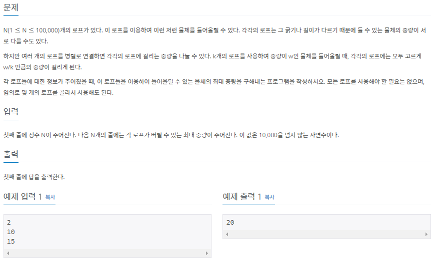 N(1 ≤ N ≤ 100,000)개의 로프가 있다. 이 로프를 이용하여 이런 저런 물체를 들어올릴 수 있다. 각각의 로프는 그 굵기나 길이가 다르기 때문에 들 수 있는 물체의 중량이 서로 다를 수도 있다. 하