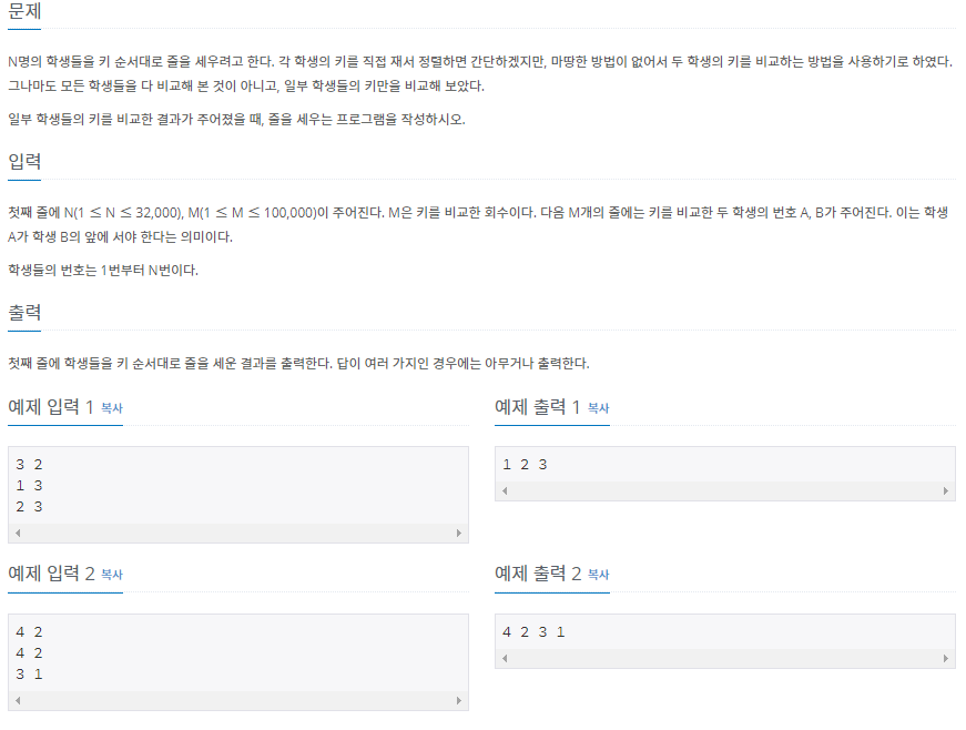 첫째 줄에 N(1 ≤ N ≤ 32,000), M(1 ≤ M ≤ 100,000)이 주어진다. M은 키를 비교한 회수이다. 다음 M개의 줄에는 키를 비교한 두 학생의 번호 A, B가 주어진다. 이는 학생 A가 학생 B의 앞에 서야 한다는 의