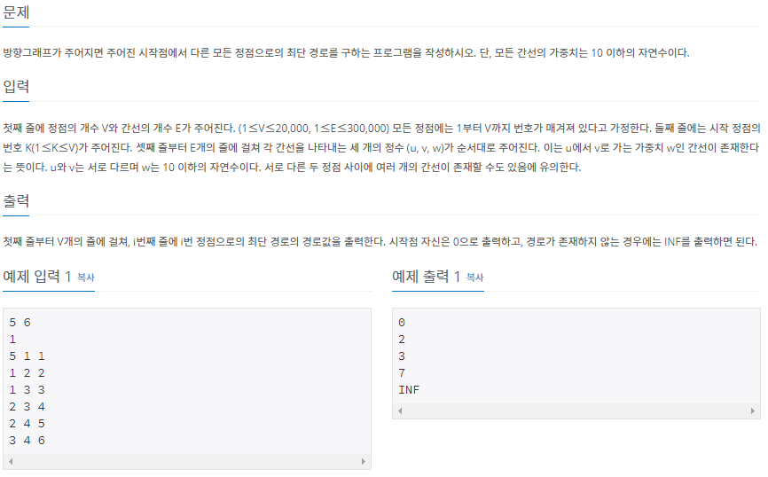 첫째 줄에 정점의 개수 V와 간선의 개수 E가 주어진다. (1≤V≤20,000, 1≤E≤300,000) 모든 정점에는 1부터 V까지 번호가 매겨져 있다고 가정한다. 둘째 줄에는 시작 정점의 번호 K(1≤K≤V)가 주어진다.